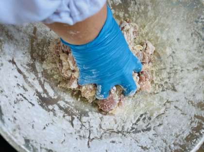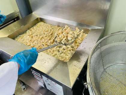 給食室で鶏肉のからあげを作っているようすです。下味をつけた鶏肉にでんぷんをまぶし、あぶらであげます。