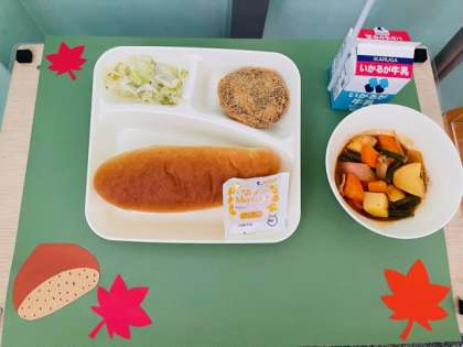 チキンレバーカツ、ケチャップ煮、キャベツのバジル風味サラダ、コッぺパン、マーマレード、牛乳