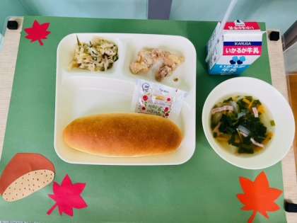 鶏肉のからあげ、とうがんの中華スープ、切干しだいこんのごま辛みづけ、コッペパン、りんごジャム、牛乳