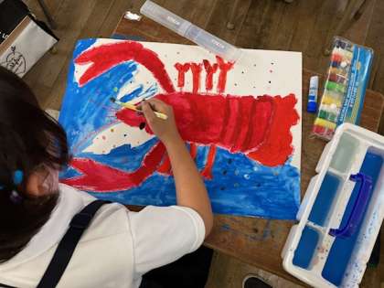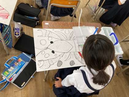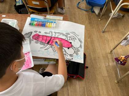 2年生がとても上手にザリガニの絵を描いています。完成が楽しみです。