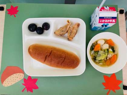 あげぎょうざ、中華煮、ぶどう(巨峰)、黒糖パン、牛乳