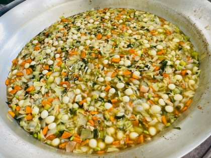 給食室で中華煮を作っているようすです。鶏肉、うずら卵、たまねぎ、キャベツ、にんじん、チンゲンサイ、えだまめが入っています。