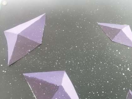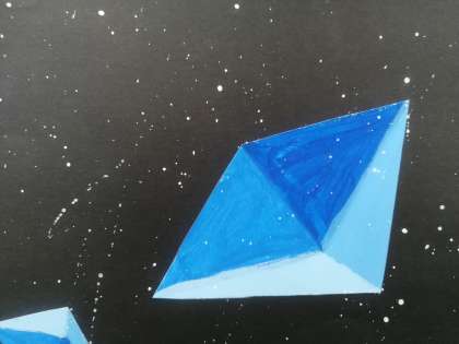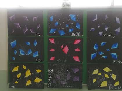 なぜこのように見えるかと申しますと、まず、画用紙を四角形に形どり、立体的に見えるように分けられた面を絵具をつかって微妙に4色に色を変えて塗ります。次に黒の画用紙の上に張り付け、星のイメージなる点を画用紙にふりかけて完成させています。画用紙に張り付けるこのひと手間が作品をよくしているのですね。