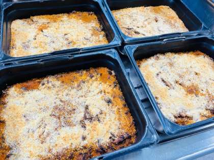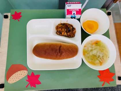 なすのミートグラタン、鶏肉の野菜スープ、黄桃(缶)、黒糖パン、牛乳