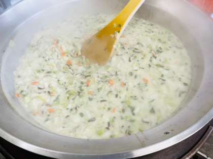 給食室ではくさいのクリーム煮を作っているようすです。鶏肉、はくさい、たまねぎ、チンゲンサイ、にんじん、しいたけが入っています。