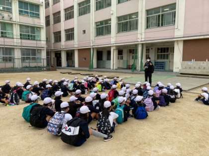 秋の遠足、最後は3年生です。これから鶴見緑地に向け出発します。