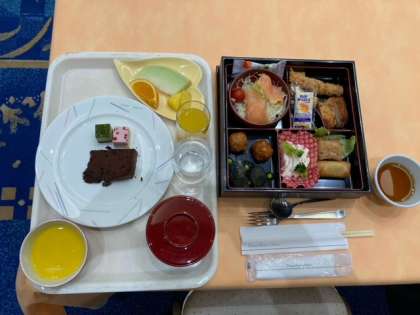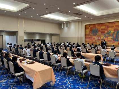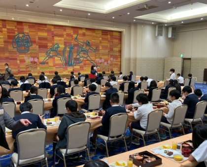 待ちに待った夕食の時間です。感染症対策のためみんな同じ方向を向いて食べます。今日はたくさん活動をしたのでお腹ぺこぺこです。たくさん食べましょう。