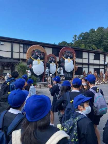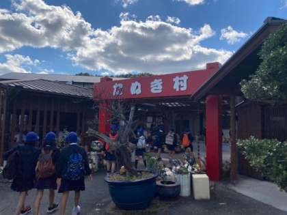 たぬき村に到着しました。大きなたぬきがお出迎えです。昼食の後、陶芸体験です。