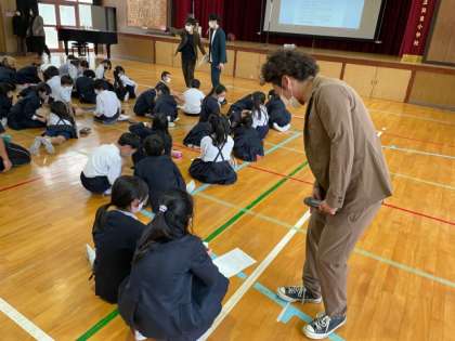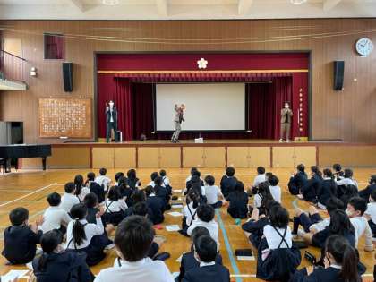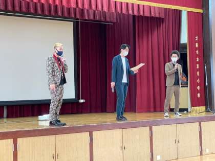 今日の2・3時間目、4年生を対象とした出前授業がありました。これは生野区の「生きるチカラ学びサポート」事業のプログラムのひとつで、吉本興業の漫才師ツートライブさんとピン芸人のガオーちゃんさんが来校してくれました。「漫才教育で子どもたちが変わる」と題し、子どもたちが友だちとコンビを組み漫才を考え、みんなの前で発表するという授業でした。授業の最後には藤本先生と青山先生のコンビが漫才を披露しました!