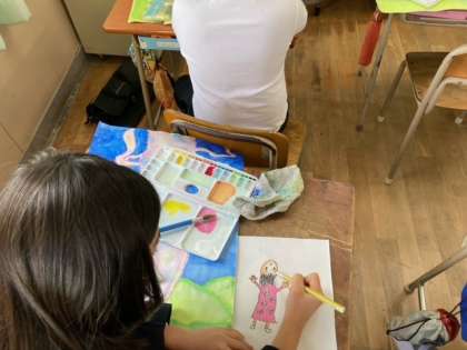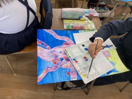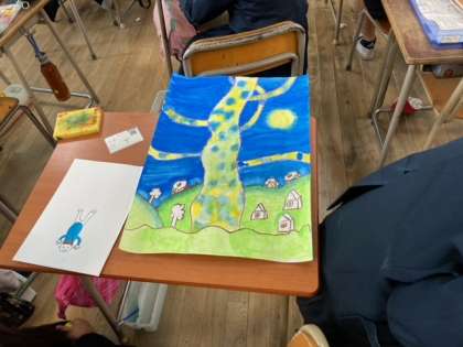 4年生の図工の様子です。パスと絵の具で木を書いています。