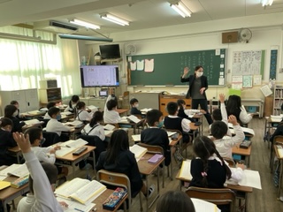 1年1組は国語の授業「おとうとねずみチロ」、2組は「ことばあそび」の授業をしました。