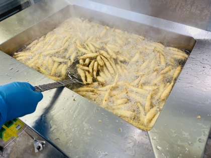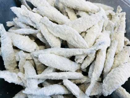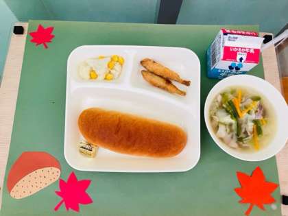わかさぎフライ、スープ、カリフラワーとコーンのサラダ、コッぺパン、バター、牛乳