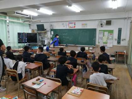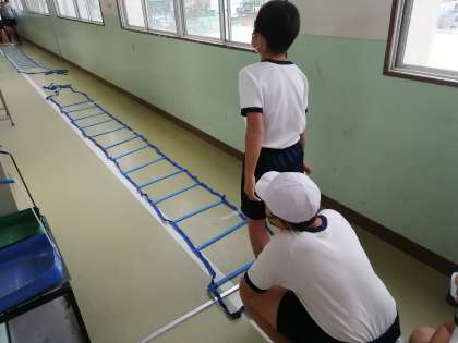 今日はあいにくの雨なので、運動場でできるクラブは、教室でルールの確認やチーム編成を組んだり、廊下で軽く運動したりして活動していました。