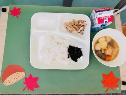 関東煮、れんこんの梅風味焼き、のりのつくだ煮、ごはん、牛乳