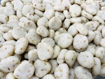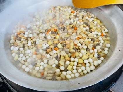 給食室で関東煮を作っているようすです。関西ではおでんのことを関東煮といいます。今回は鶏肉、うずら卵、ごぼう平天、じゃがいも、こんにゃく、あつあげ、だいこん、にんじんが入っています。