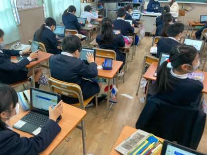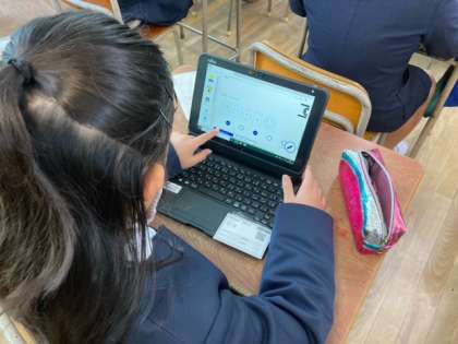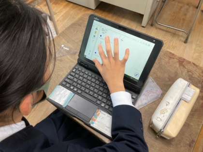4年生が、タブレットドリルで学習しています。問題に正解するとどんどんレベルが上がっていくので、楽しく学習できます。