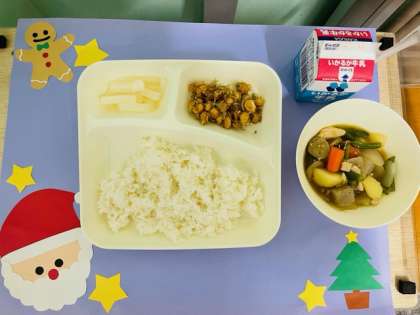 鶏肉と野菜の煮もの、じゃこ豆、かぶのゆず風味、ごはん、牛乳