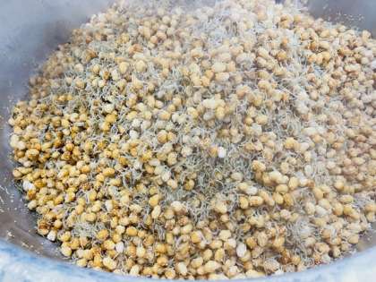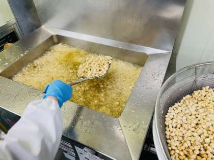 給食室でじゃこ豆を作っているようすです。熱湯にひたした大豆にでんぷんをまぶし、あぶらであげます。ゆでたちりめんじゃこ、いりごま、調味料と合わせます。