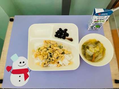 親子丼、すまし汁、黒豆の煮もの、牛乳