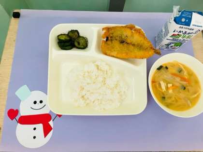 いわしフライ、みそ汁、きゅうりの赤じそあえ、ごはん、牛乳