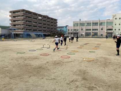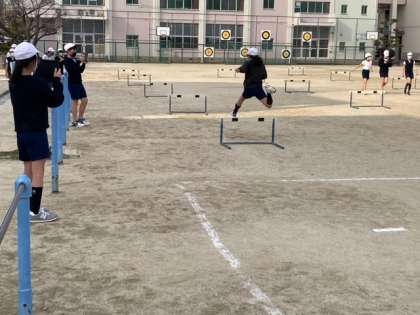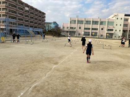 5年生のハードル走の様子です。走っている様子をタブレットで撮影し、自分のフォームを確認しています。