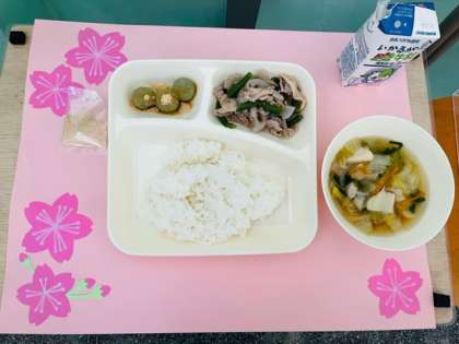 豚肉とれんこんのいため煮、五目汁、きな粉よもぎだんご、ごはん、牛乳