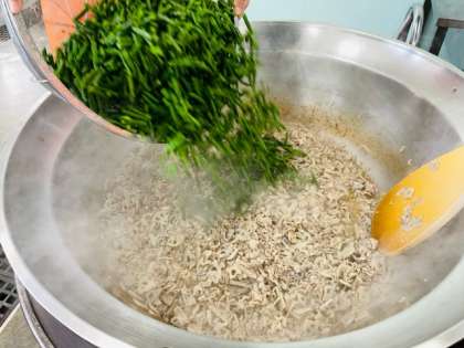 給食室で豚肉とれんこんのいため煮を作っているようすです。豚肉、れんこん、さんどまめが使われています。