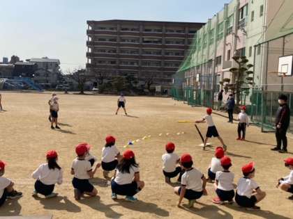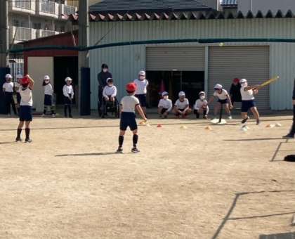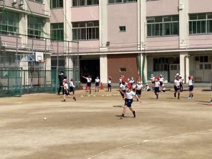 体育科ティーボールの学習の様子です。豪快なバッティングで外野の奥深くまでボールを飛ばす児童もいました。