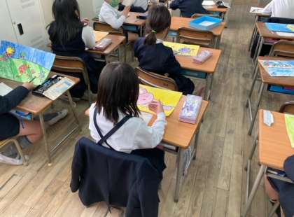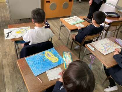 1年生は友達が描いたお話の絵を見て、よく描けているところや工夫しているところなど感想を書きました。