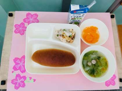 マカロニグラタン、レタスのスープ、みかん(缶)、黒糖パン、牛乳