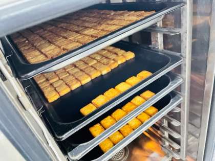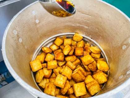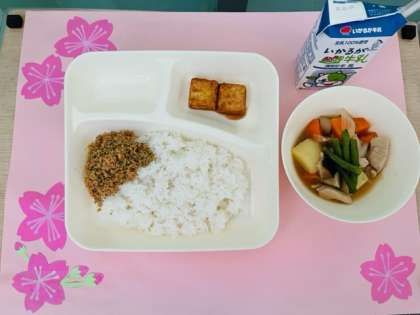 鶏肉とじゃがいもの煮もの、あつあげのしょうゆだれかけ、紅ざけそぼろ、ごはん、牛乳