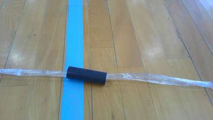 すずらんテープにパイプを通しボールを投げるときの感覚を身につける運動