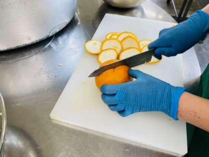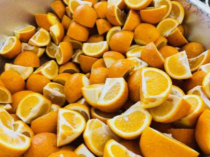 学校給食では旬の果物が登場します。本日はあまなつかんです。ひとり1/4切れずつつきます。