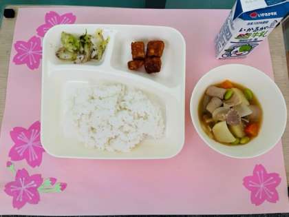 まぐろのオーロラ煮、豚肉と野菜の煮もの、キャベツの赤じそあえ、ごはん、牛乳