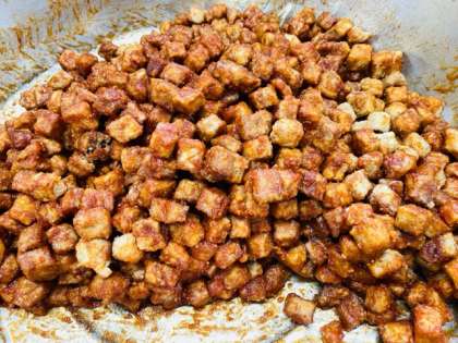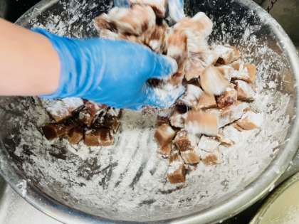 給食室でまぐろのオーロラ煮を作っているようすです。しょうが汁と料理酒で下味をつけたまぐろにでんぷんをまぶし、あぶらであげます。ケチャップ、砂糖、赤みそを合わせたたれと、あぶらであげたまぐろをからめます。