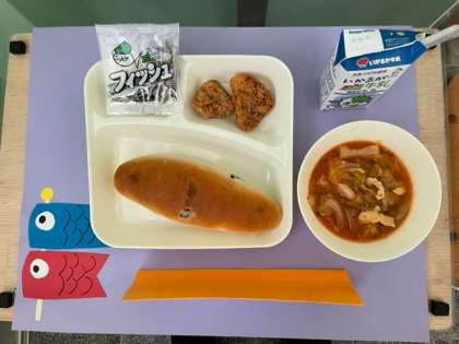ミネストローネ、一口とんかつ、ミニフィッシュ、レーズンパン、牛乳