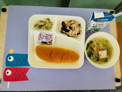 金時豆の中華おこわ、中華スープ、ツナと野菜のオイスターソースいため、コッペパン、いちごジャム、牛乳