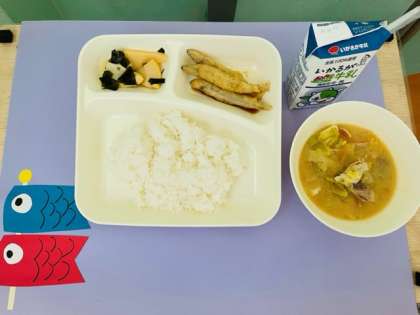 きびなごてんぷら、豚汁、わかたけ煮、ごはん、牛乳