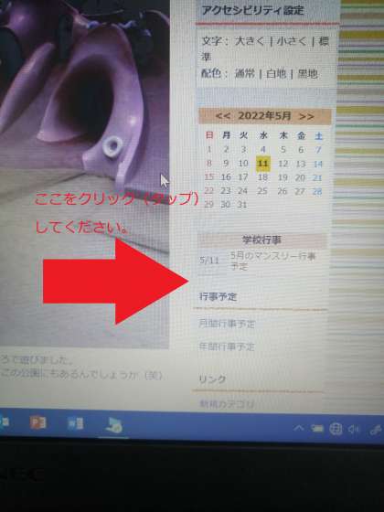 巽東小学校の月間行事予定をすぐに見ていただけるようなりました。画面の右の項目欄に学校行事のカーソルをクリック(タップ)してください。5月のマンスリーにジャンプしてご覧いただけるようになります。