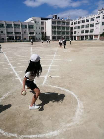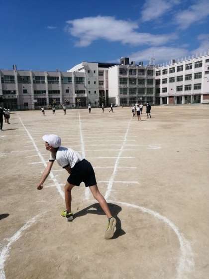 ソフトボール投げは、投げる角度や軸足の使い方を教わり、力いっぱい投げていました。中には50m以上投げた6年生がいたそうです。すごい!!