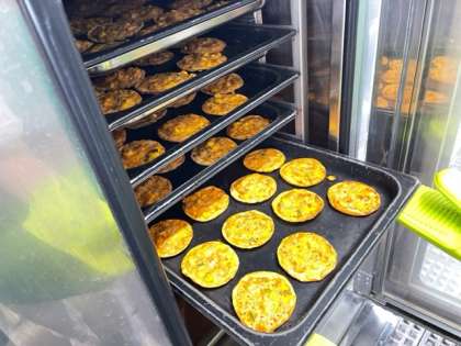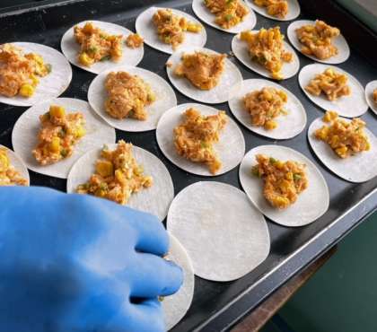 給食室で変わりピザを作っているようです。鉄板にぎょうざの皮を並べます。その上に、ツナ、コーン、ピーマン、ピザソース、チーズを混ぜ合わせたものをのせ、焼き物機で焼きます。