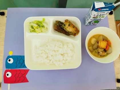 ちくわのいそべあげ、あつあげとさといものみそ煮、あっさりキャベツ、ごはん、牛乳