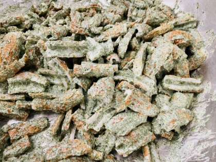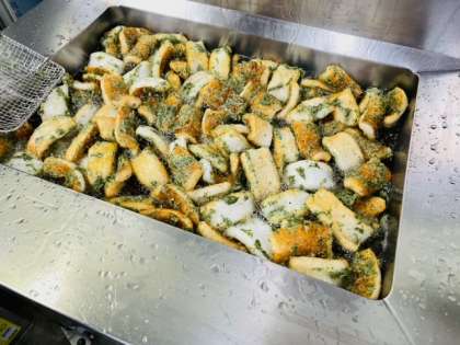 給食室でちくわのいそべあげを作っているようすです。水、小麦粉、あおのりで衣をつくり、ちくわにつけてあぶらであげます。