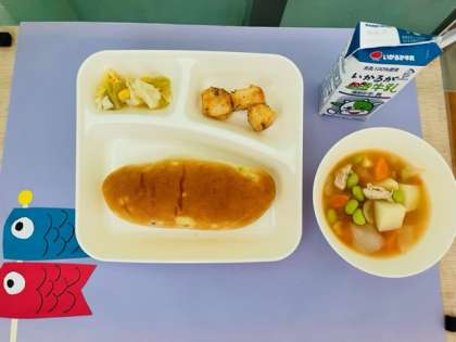 いかてんぷら、フレッシュトマトのスープ煮、サワーソテー、ごはん、牛乳