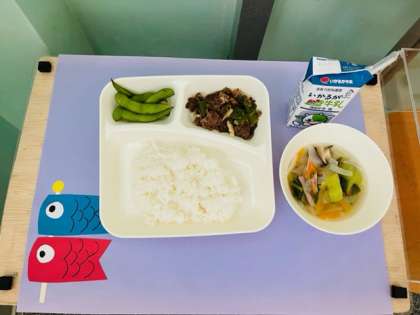 チンジャオニューロウスー、ハムと野菜の中華スープ、えだまめ、ごはん、牛乳