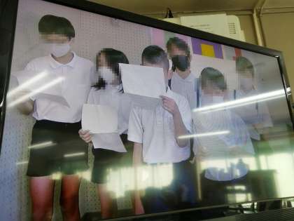 集会委員会の子どもたちが進行して問題と答えをビデオ放送をつかって発表していました。