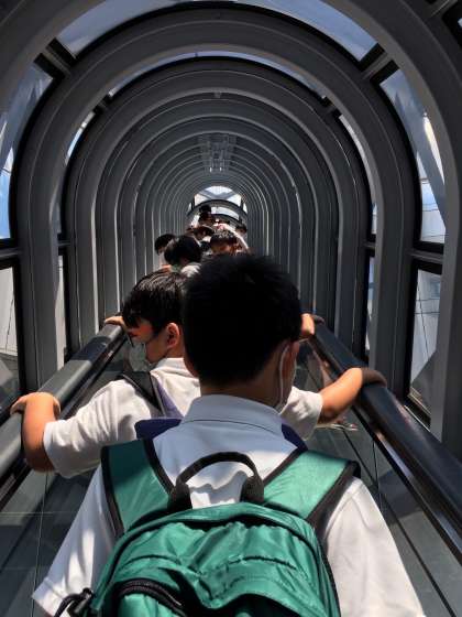 近未来型のエスカレーターを上り、大パノラマの世界が広がっています。