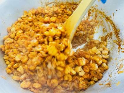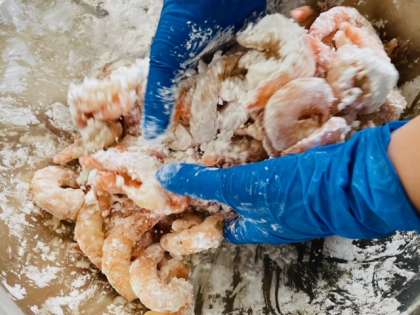給食室でえびのチリソースを作っているようすです。下味をつけたえびにでんぷんをまぶし、あぶらであげます。チリソースとえびをからませます。
