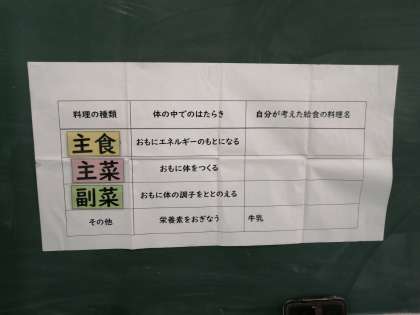 さすが6年生です。イラストから主食・主菜・副菜の仲間分けに取り組み、主な栄養素について学習していました。