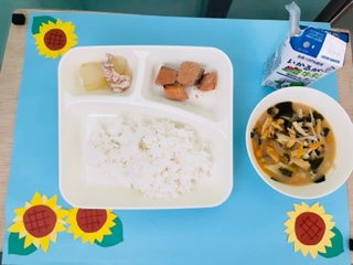 さけのつけ焼き、みそ汁、とうがんの煮もの、ごはん、牛乳